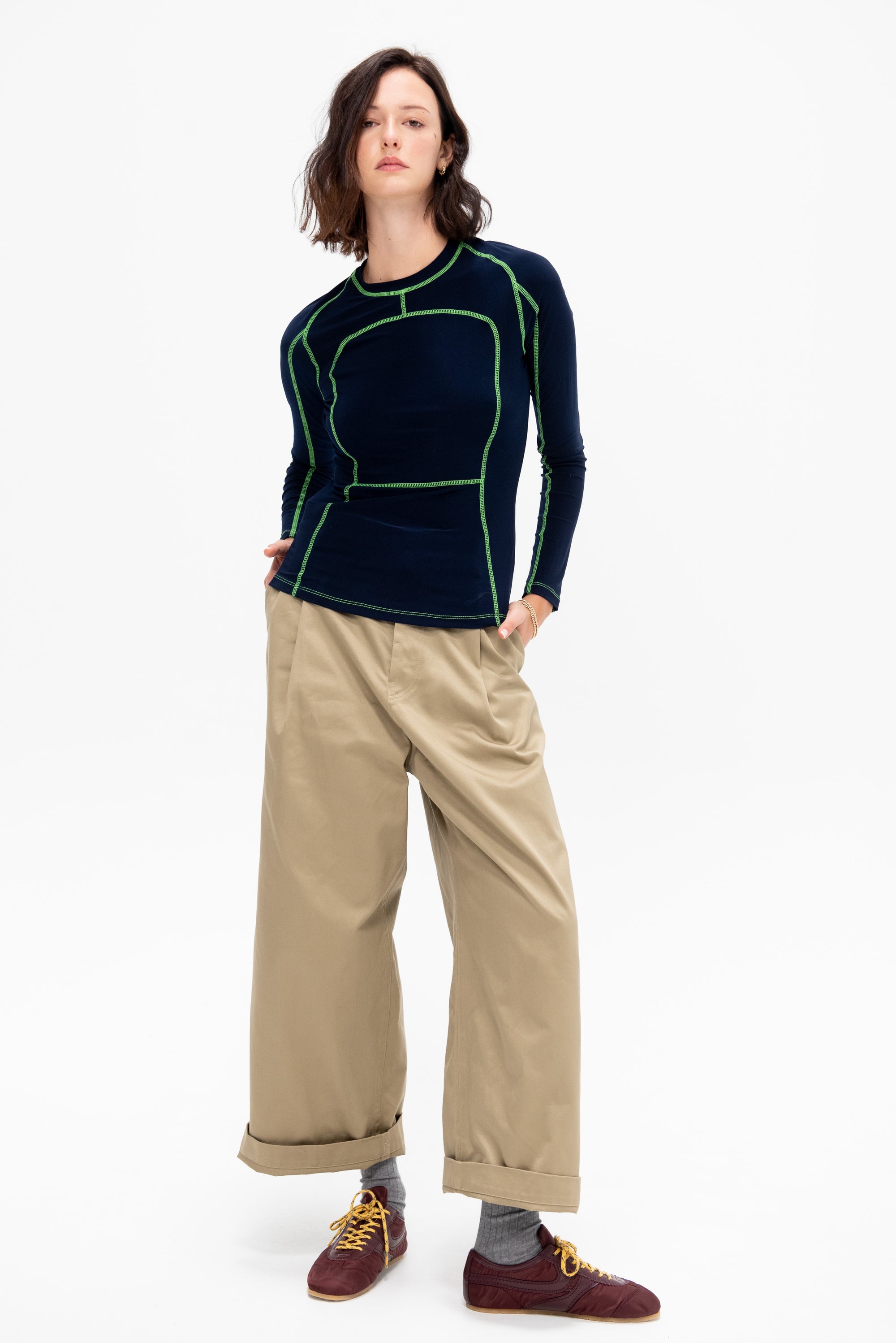 NOMIA DESIGN Long Sleeve Paneled Scuba Top, Ink & Grass