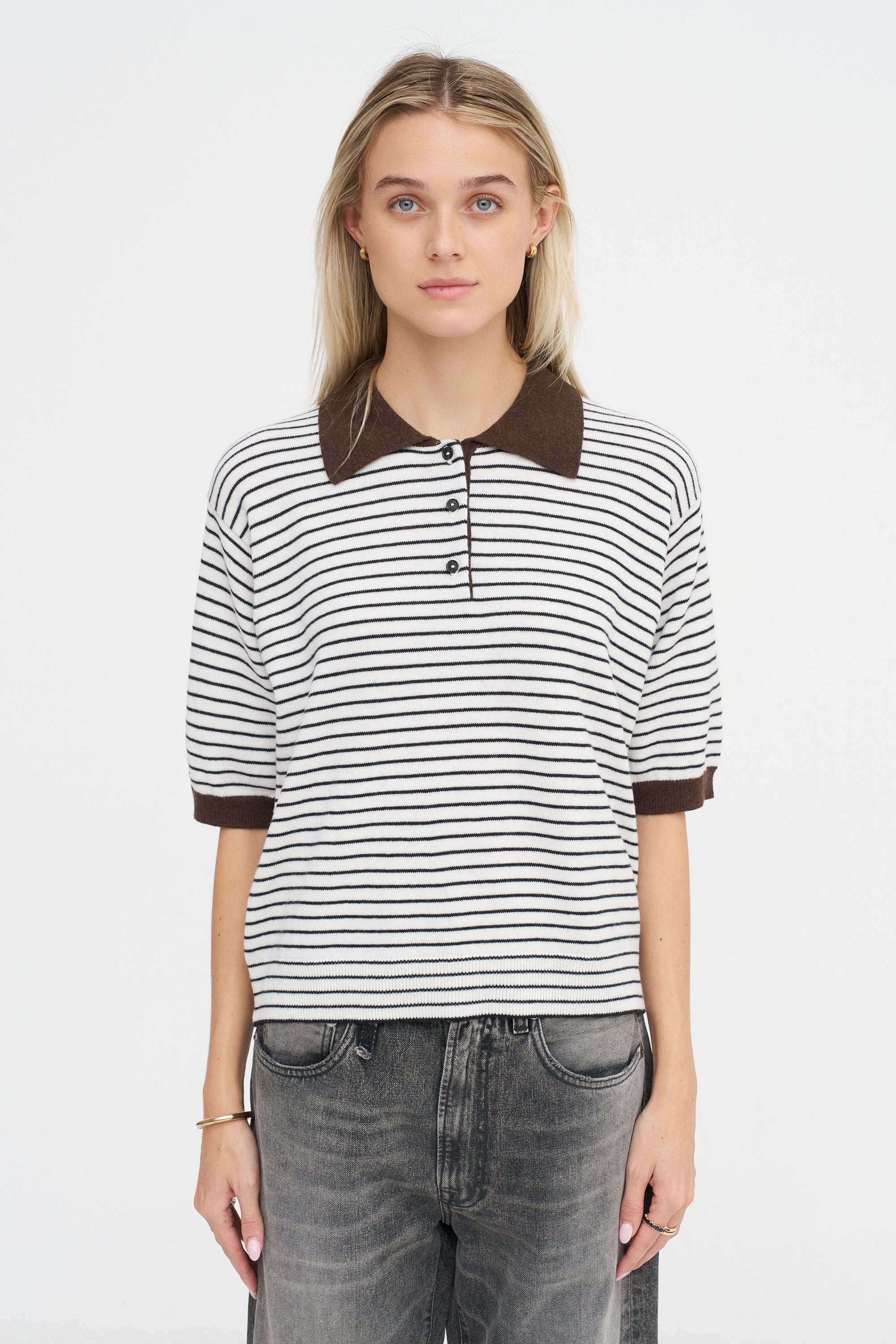 Merino Wool Striped Polo, Brown & White