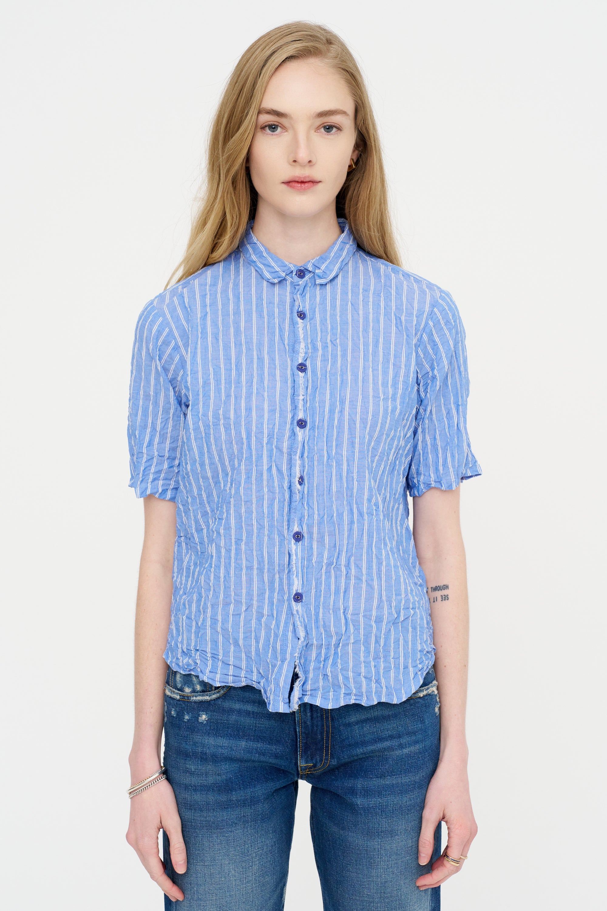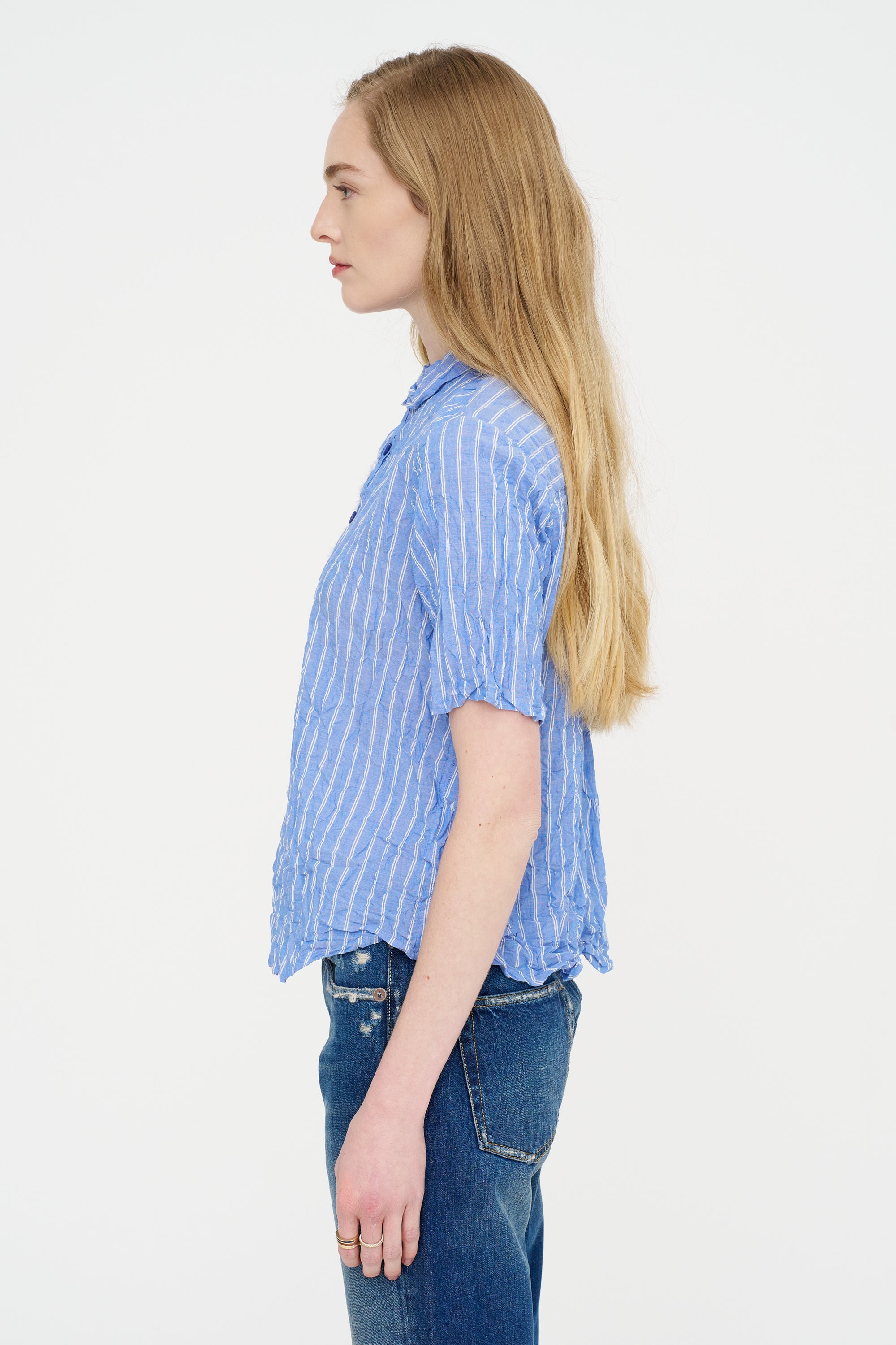 Blue Shirring Stripe Short Sleeve Blouse, Saxe Blue