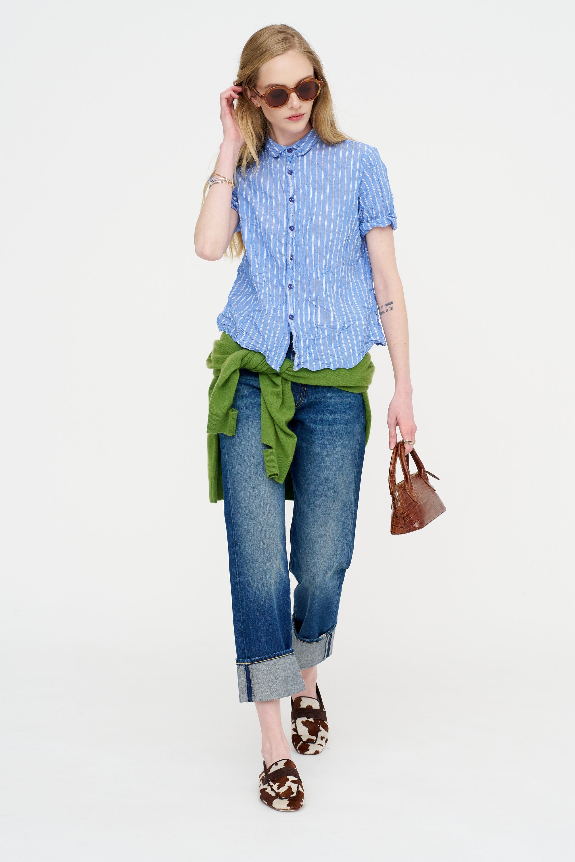 PAS DE CALAIS Blue Shirring Stripe Short Sleeve Blouse, Saxe Blue